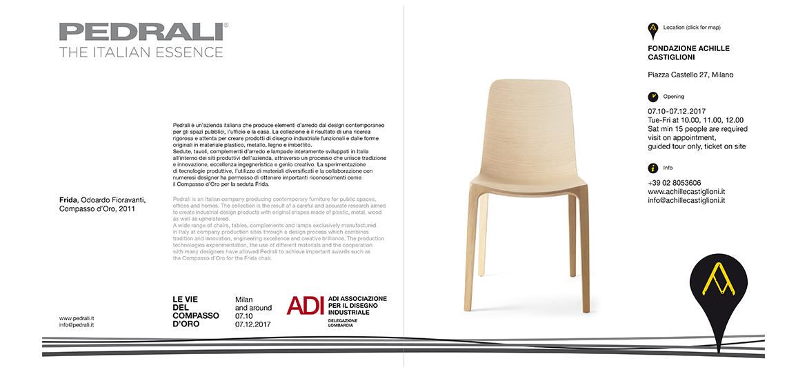 Frida, disegnata da Odo Fioravanti e vincitrice del Compasso d’Oro nel 2011 “per la semplice bellezza scultorea”, sarà esposta all’interno della Fondazione Achille Castiglioni in Piazza Castello, 27 nell’ambito de Le Vie del Compasso d’Oro, l’iniziativa presentata da ADI Lombardia, per offrire al grande pubblico un’esperienza diretta di luoghi storici e contemporanei legati al prestigioso Premio.