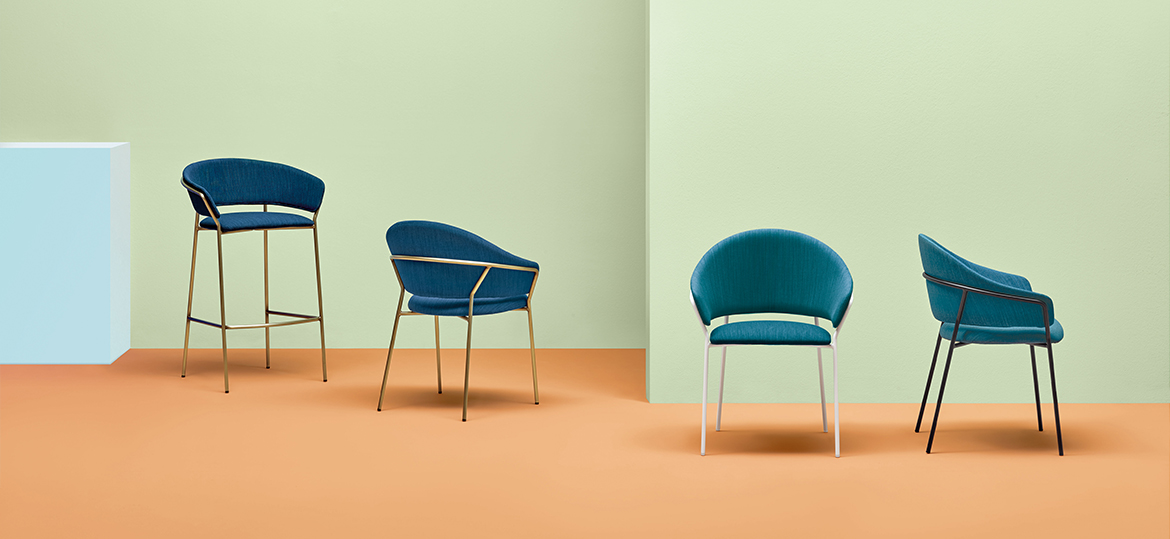Armonia di forme, ergonomia ed eleganza sono le caratteristiche della poltroncina e dello sgabello Jazz. Un’accogliente seduta e uno schienale curvato e avvolgente, separati da un’apertura che rende la collezione funzionale, sono sostenuti da una leggera struttura in acciaio che ne garantisce il giusto equilibrio di proporzioni e spessori. Finiture: rivestimento in tessuto o pelle. Acciaio verniciato oppure finitura ottone anticato o titanio.