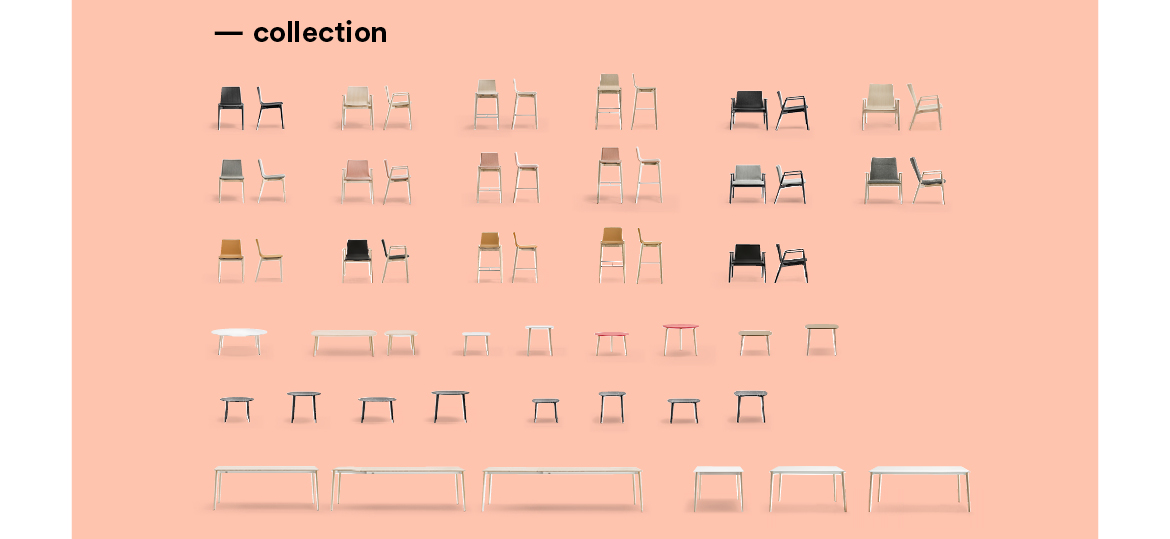 La collezione, che comprende sedia, poltrona, anche in versione lounge, e sgabello, è stata pensata come un oggetto accogliente, dalle linee morbide, in grado di garantire una comodità ancora maggiore nelle versioni imbottite in tessuto, in pelle, o in cuoio naturale. Completano la famiglia anche il tavolo e un set di tavolini, disponibili in diverse dimensioni.